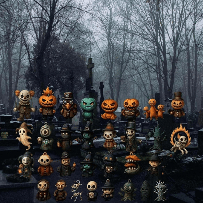 Innehåller stående figurer, dinglande hängen och små dekordetaljer. Ställ dem på hyllor, häng dem spöklikt på väskor eller grenar, eller dekorera Halloween-träd, kransar och festuppsättningar!