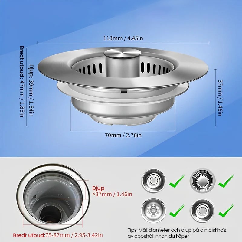 Designad för att passa standard 3 1/2 tum avlopp, ger denna köksstoppare en smidig installationsprocess. Den passar de flesta diskhoar i svenska hem, vilket gör det enkelt att uppgradera kökets installation.